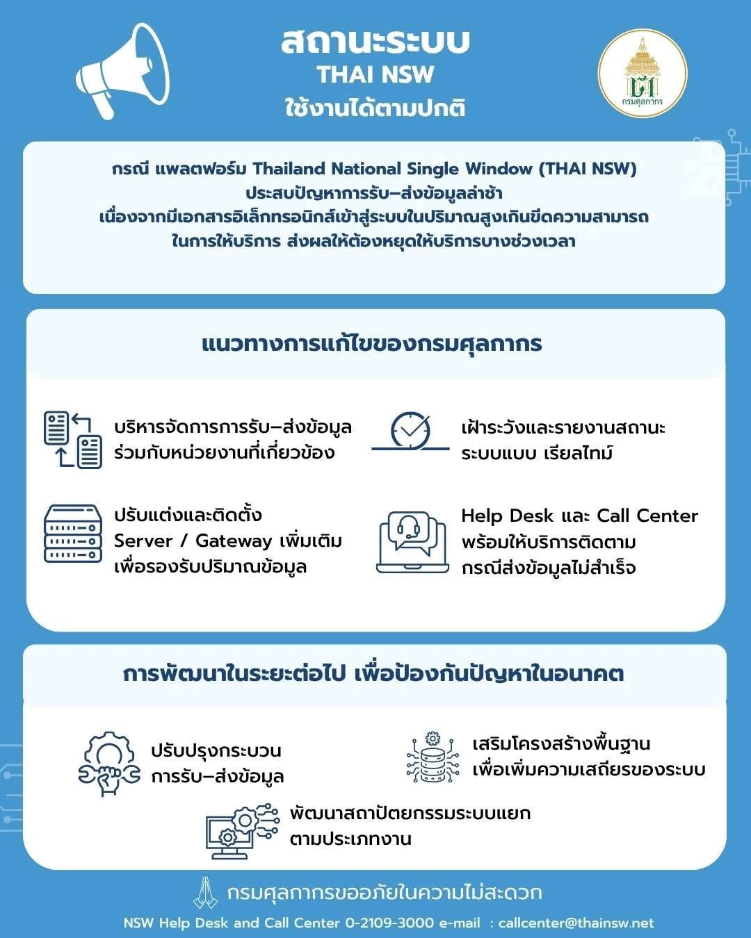 6 พฤศจิกายน 2568 : เกิดปัญหาการรับส่งข้อมูลผ่านแพลตฟอร์มกลาง Thailand National Single Window (THAI NSW)