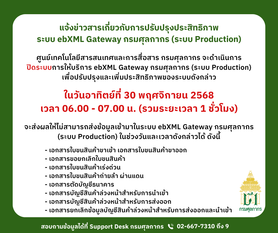 30 พฤศจิกายน 2568 : กรมศุลกากร แจ้งปิดระบบการให้บริการ ebXML Gateway ระบบงานจริง (Production)
