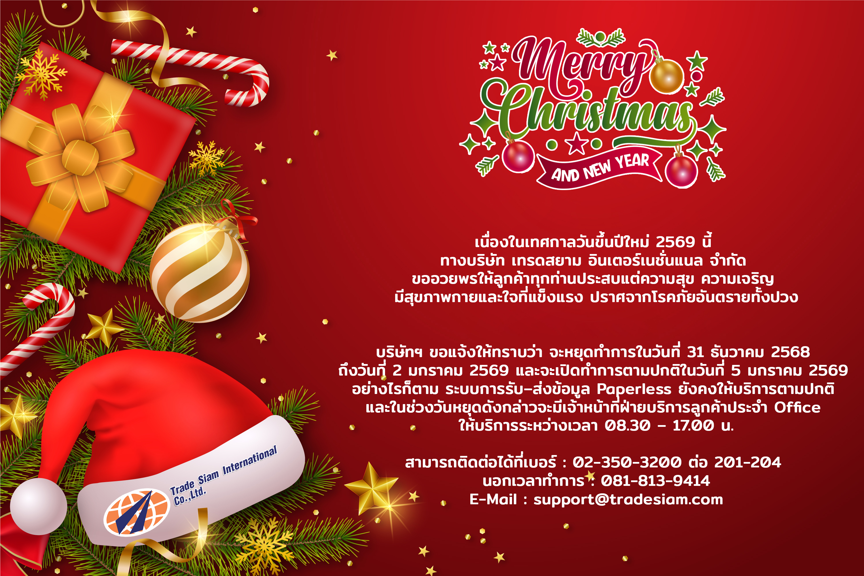 เนื่องในเทศกาลวันขึ้นปีใหม่ 2569 นี้ ทางบริษัท เทรดสยาม อินเตอร์เนชั่นแนล จำกัด ขออวยพรให้ลูกค้าทุกท่านประสบแต่ความสุข ความเจริญ มีสุขภาพกายและใจที่แข็งแรง ปราศจากโรคภัยอันตรายทั้งปวง